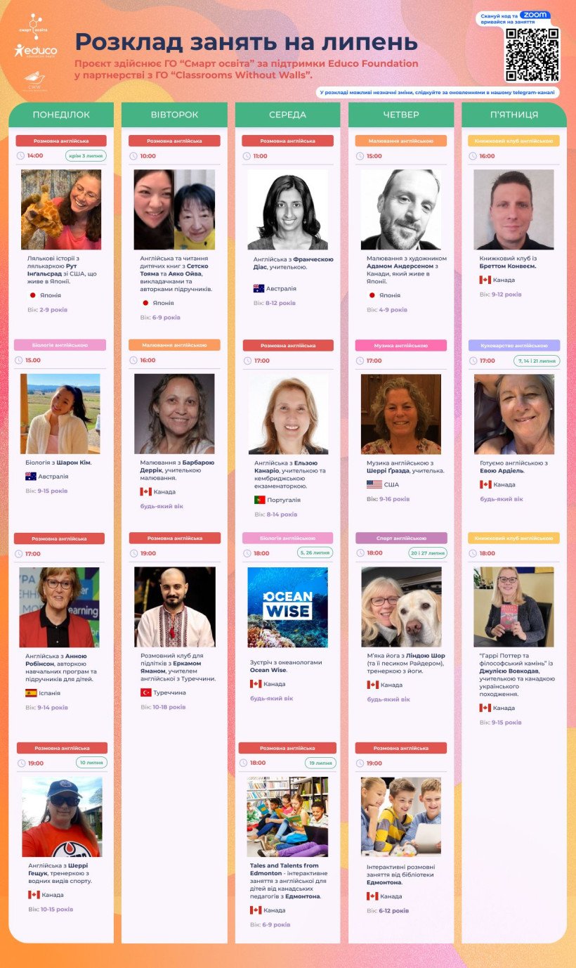 Проєкт запустила ГО «Смарт освіта» ще в перші дні повномасштабної війни. Тепер він передбачає десятки онлайн-уроків на тиждень для дітей різного віку, які проходять на платформі Zoom. Слідкувати за новинами можна в Telegram-каналі проєкту. Особливості цих англомовних онлайн-уроків: