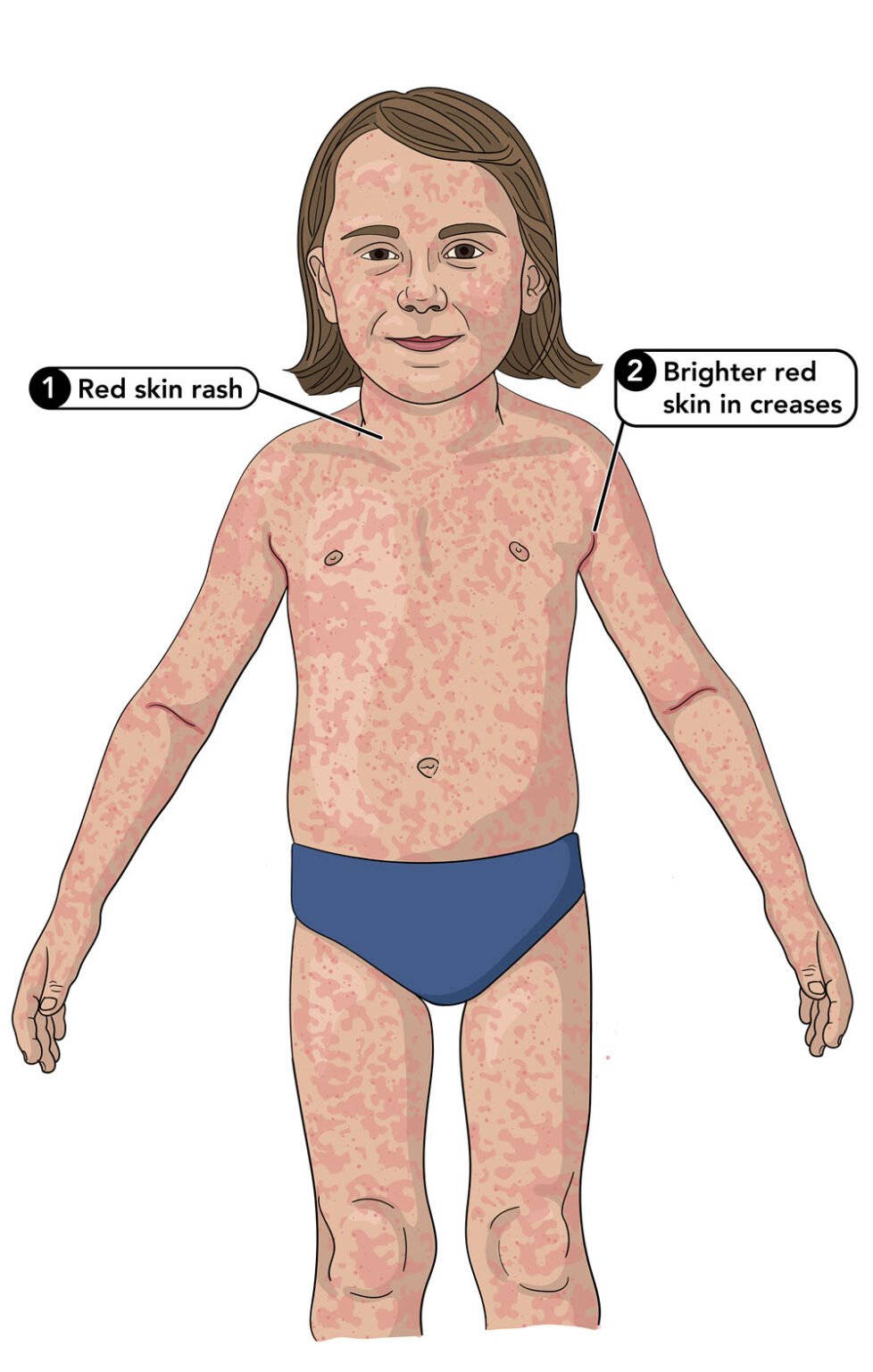 Через 2-6 дней сыпь бледнеет, покрывается чешуйками и на его городе отслаивается кожа. Это может длиться до 3 недель и типично именно для скарлатины, помогающей в диагностике.