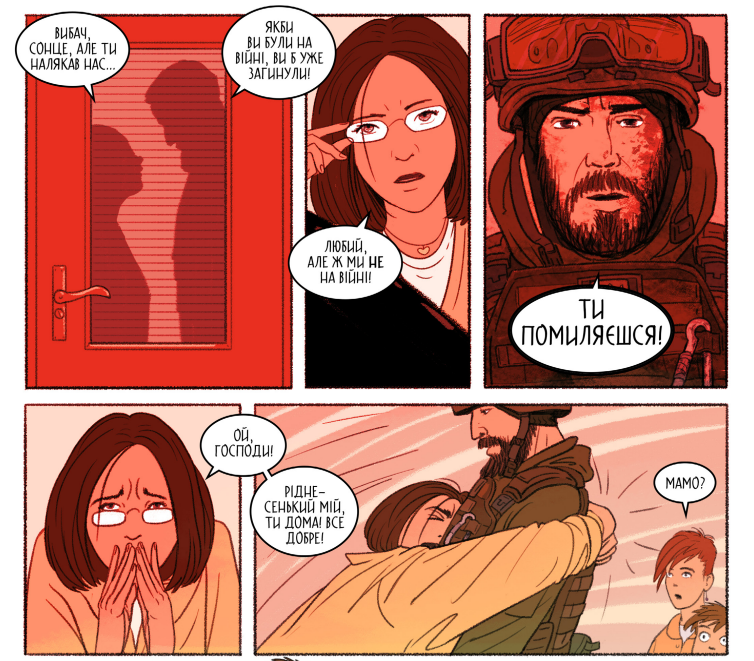 «Історія, що розкрита в коміксі, починається в умовах бойових дій, і продовжується після повернення батька з госпіталю (його комісували за пораненням). Непрості ситуації, в яких проявляються складності в спілкуванні між цивільними людьми з учасниками бойових дій. Як це долати, як підтримати ветерана та надати йому нову силу та сенсі, читайте в нашому коміксі».