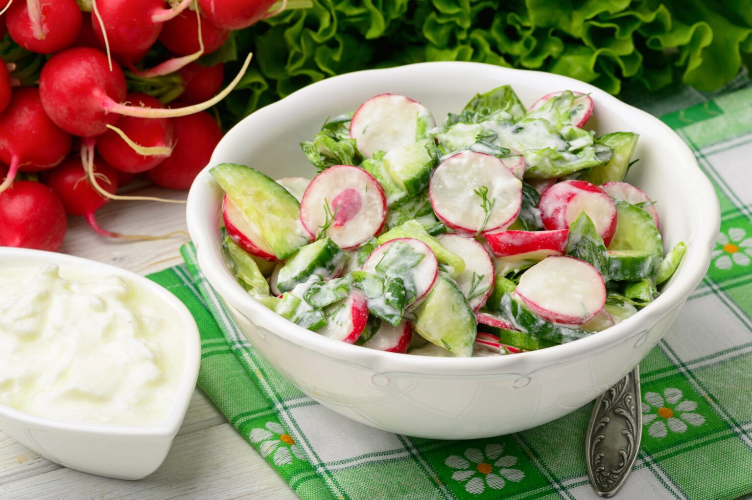 Старшему ребенку можно предложить свежую редис в составе овощного салата – его можно тонко нарезать или натереть на терке и заправить натуральным йогуртом или оливковым маслом.