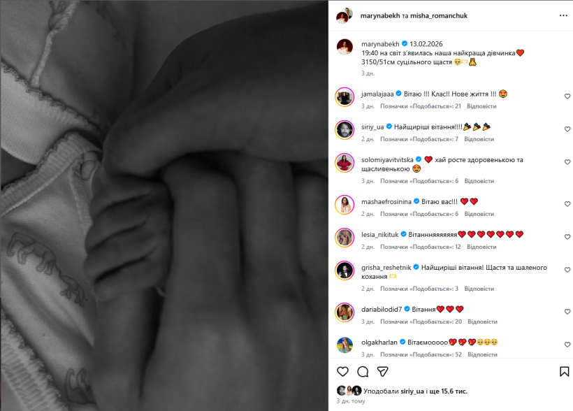 Дівчинка народилась 13 лютого, про що її батьки сповістили також через соцмережі. Спільний пост зібрав безліч лайків та привітань. Родину привітали зірки шоубізнесу та спорту – Ольга Харлан, Джамала, Сергій Притула, Маша Єфросиніна та інші.
