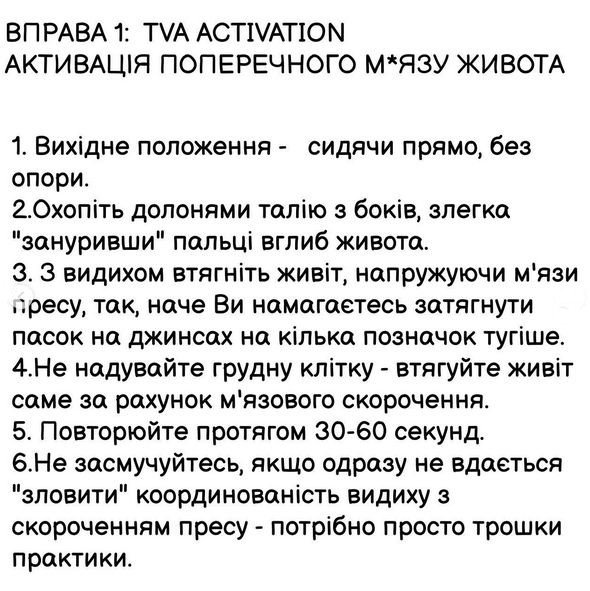 Лікарка також зауважує: наведений комплекс вправ — стартовий для більшості жінок, після 12 тижнів від пологів. Рівень — початковий. Універсальність його полягає в загально однаковій дії вправ на людське тіло, як таке.