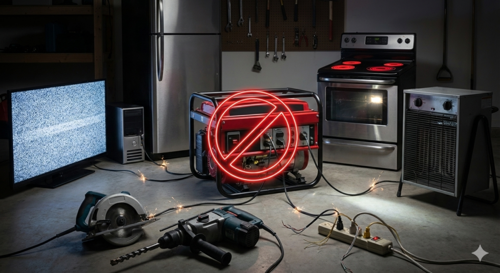 Электроплиты и промышленные обогреватели потребляют большое количество электроэнергии. Большинство бытовых генераторов просто не рассчитаны на такие нагрузки. Постоянная перегрузка может привести к перегреву и выходу из строя генератора. Потому такую технику лучше вообще не подключать.