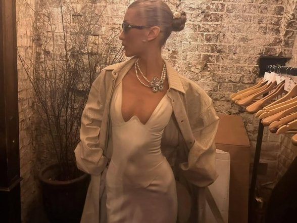 На Белле был облегающий латексный комплект белого цвета от Khy. Он состоял из скульптурного топа с тонкими бретельками и фигурным декольте (182 доллара — около 7,5 тыс. грн) и макси-юбки (234 доллара — около 9,7 тыс. грн). Дополнили образ светло-бежевый тренч, ожерелье с жемчугом и деталью в виде цветка, а также солнцезащитные очки. Завершила лук прическа пучок.