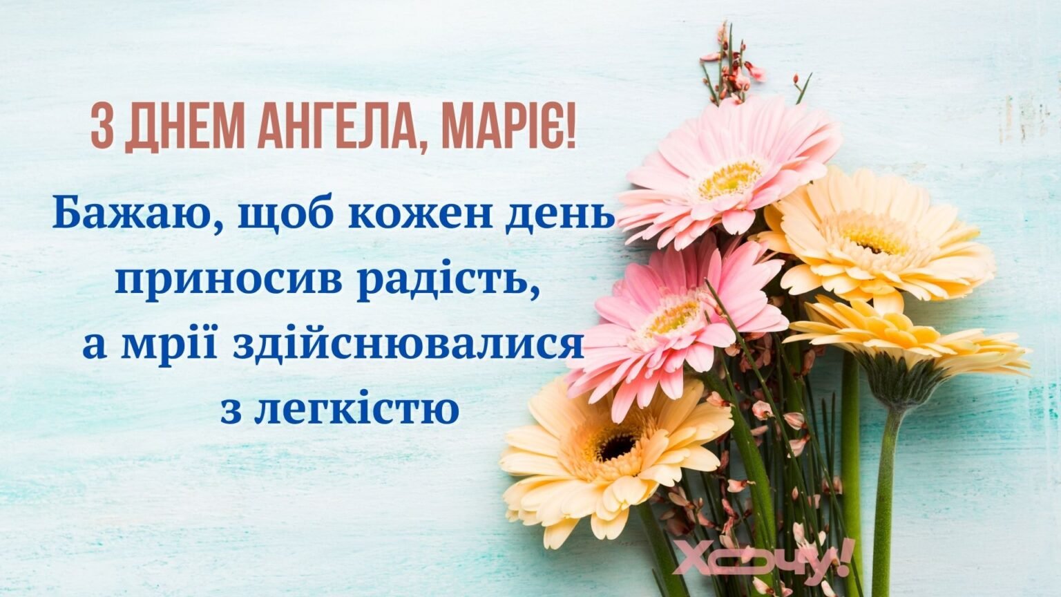 Маріє, з Днем ангела! Бажаю, щоб кожен день твого життя був наповнений теплом і щастям. Нехай всі твої мрії збуваються, а ангел-охоронець завжди оберігає і підтримує тебе на кожному кроці.