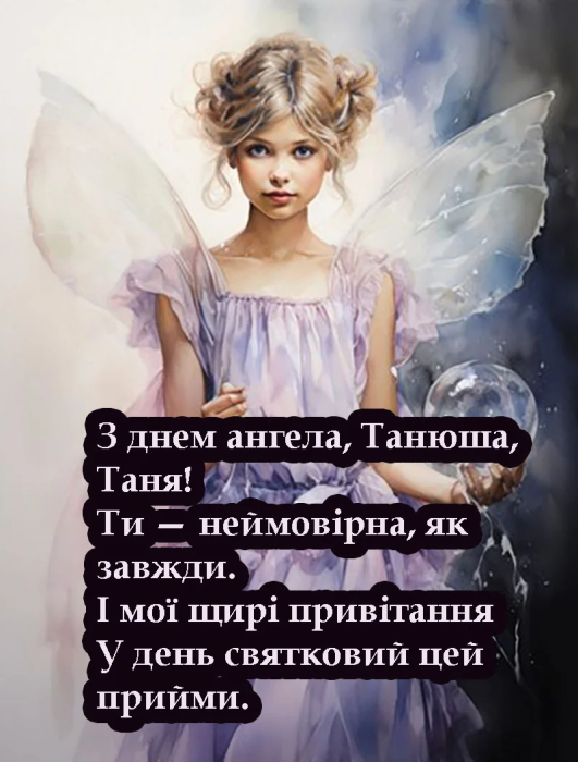 С Днем ангела, дорогая Таня! Пусть удача сопровождает тебя во всех начинаниях, а ангел предохраняет от невзгод. Пусть у тебя никогда не возникает сложных препятствий в жизни, а мечты становятся реальностью быстрее, чем ожидаешь!