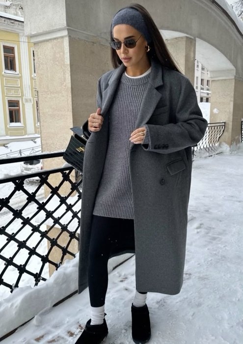 Леггинсы отлично работают как базовый слой. Их можно носить под объемный свитер в сочетании с длинным пальто или пуховиком. Такой прием придает сложности и модной многослойности, которая выглядит продуманно, а не случайно.