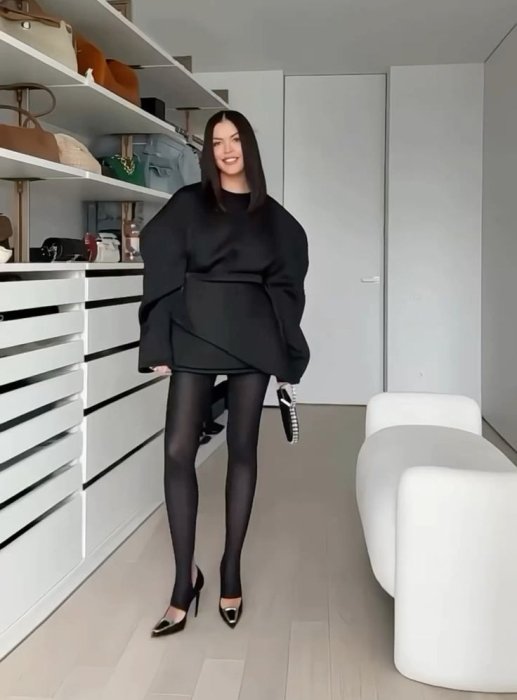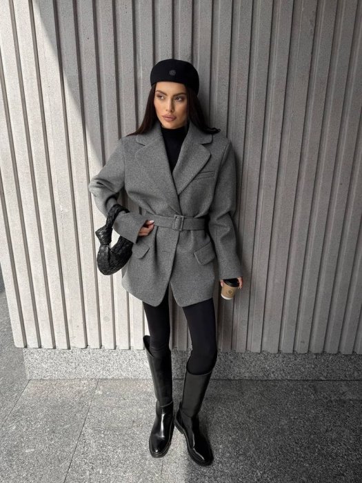 Самая безопасная и одновременно эффектная формула — леггинсы + удлиненный жакет. Объемный верх уравновешивает обжатый низ и создает четкую, собранную линию образа. Дополните высокими сапогами — и силуэт сразу становится более элегантным и более «городским».