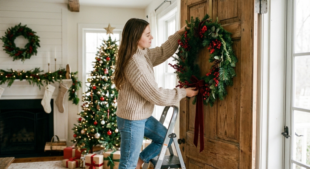 Важно крепить ленту не к декоративным элементам, а именно к основанию венка. Качественная монтажная лента держит вес и снимается без повреждения двери, а под венком она остается незаметной.