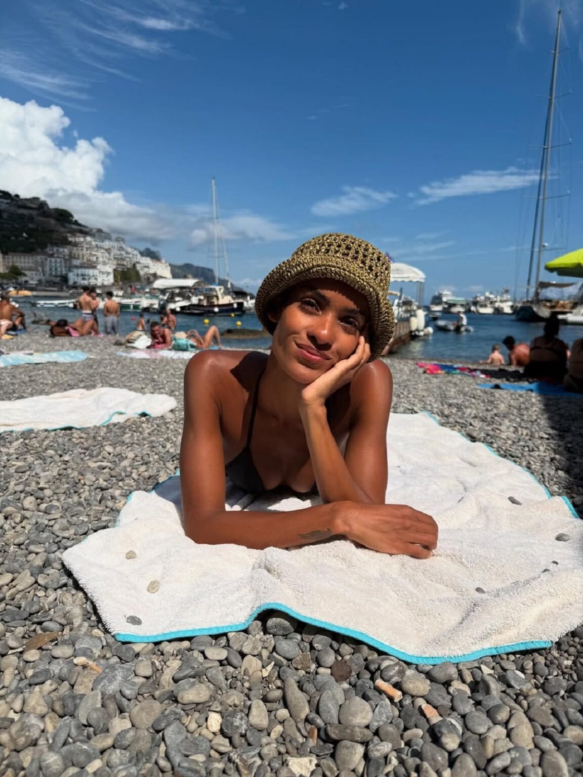 На них Нара запечатлена во время прогулки по побережью, отдыха на яхте и загара на пляже. Для последнего она выбрала модные бикини в классическом черном цвете и трендовом цвете сливочного масла с серебристыми люверсами. Оба купальника идеально подходили к подтянутой фигуре Баптисты!
