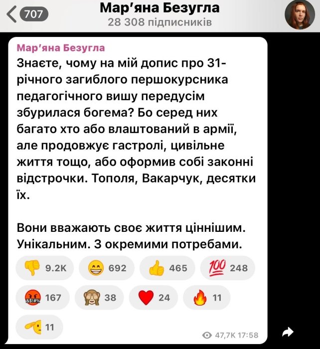 После публикации этого сообщения соцсети разразились критикой в сторону нардепки. Многие пользователи Сети, а в том числе и знаменитости, начали критиковать Безуглу за резкие и неуместные высказывания в сторону погибшего парня. В ответ Марьяна отметила, что украинская “богема” лишь официально несет службу в Вооруженных силах Украины, в то время как продолжает гастролировать и зарабатывать деньги не столько на армию, сколько на собственные нужды. В своем сообщении Безугла открыто написала о Тарасе Тополе, Святославе Вакарчуке и других артистах.