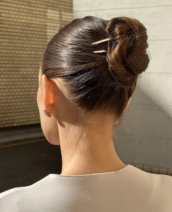 Азиатский пучок. Идеальный выбор для поклонниц лаконичного стиля. Аккуратный гладкий пучок с несколькими серебристыми палочками выглядит сдержанно, но очень изысканно. А еще такая прическа легко выдержит активный день.