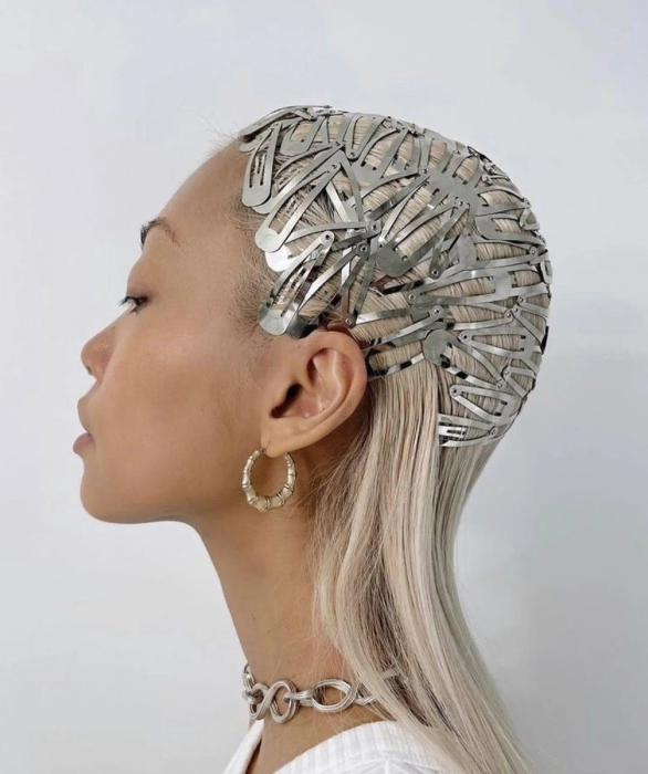 Шапочка из шипов в стиле Y2K. Ностальгия за 2000 все еще в моде. Многие серебряные шпильки, хаотично размещенные по всей голове, создают образ, который идеально подойдет для смелых фотосессий или экспериментов со стилем. Особенно красиво такой вариант смотрится на светлых волосах.