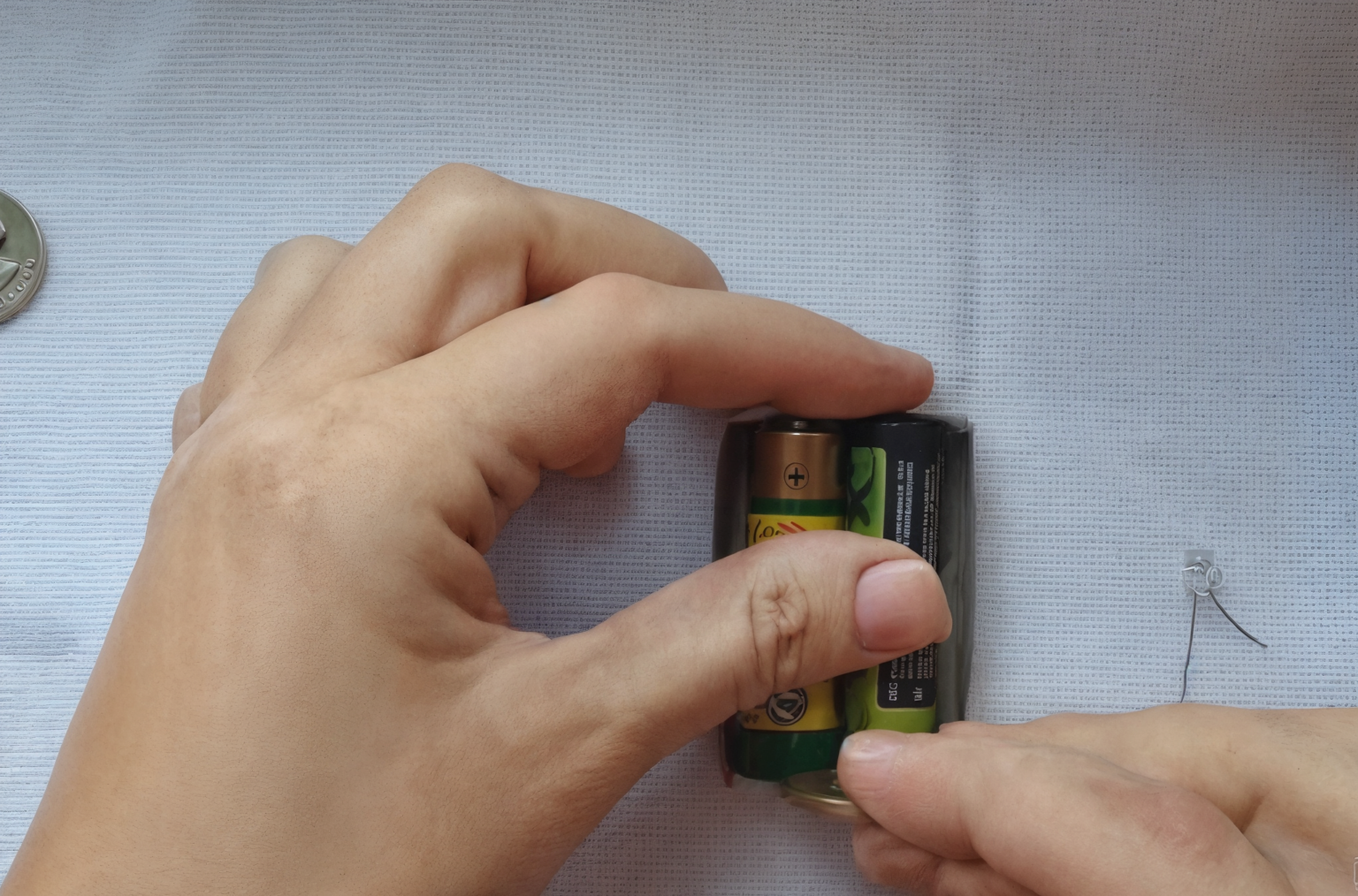 В коробочку складываем батарейки плюс к минусу (так, чтобы "пиптики" смотрели в разные стороны). С одной стороны плотно укладываем монетку. Она должна касаться обеих батареек. С другой стороны, вставляем диод так, чтобы металлические контакты касались плюса и минуса. Когда контакты закроются, фонарик загорится.