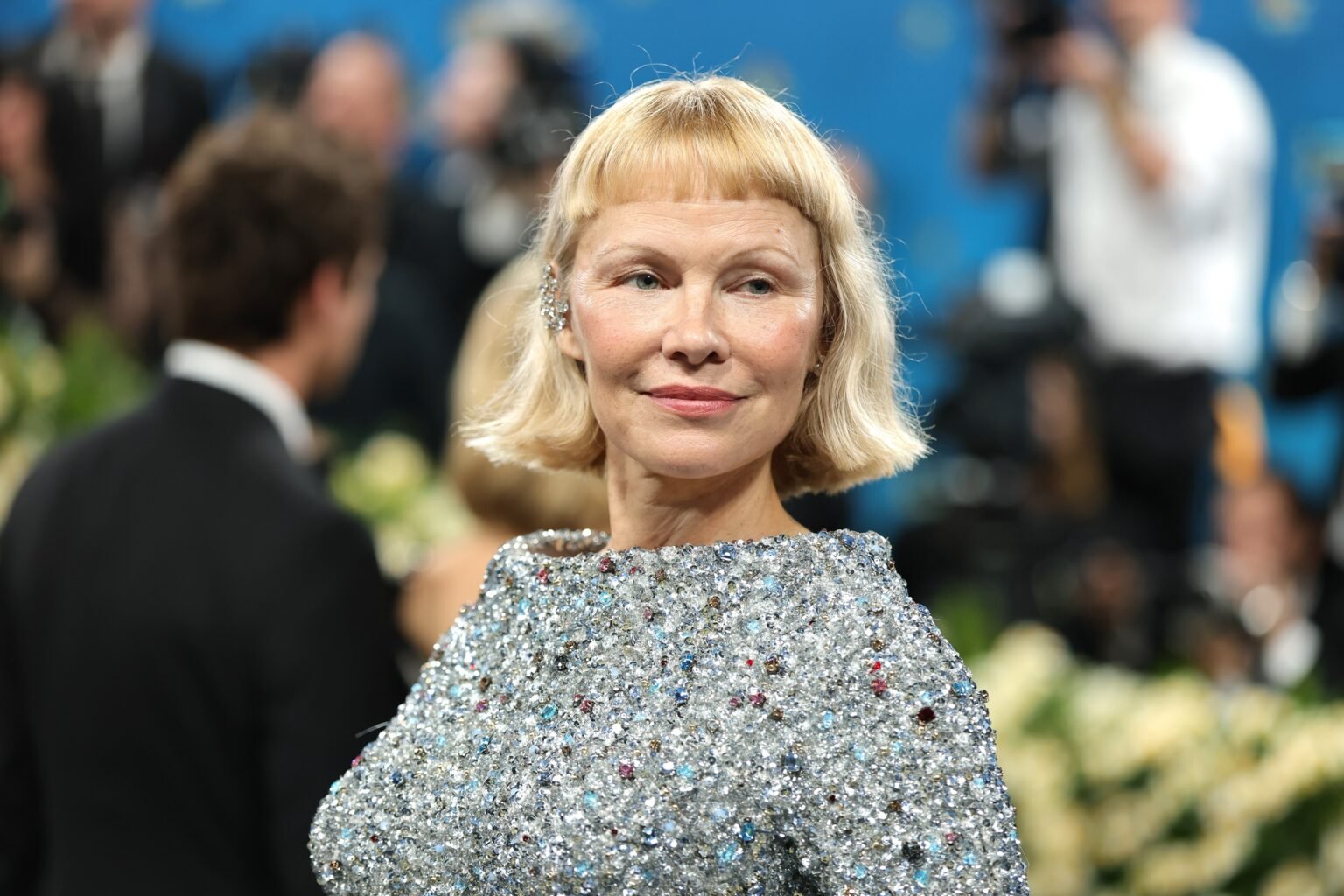 57-летняя актриса Памела Андерсон появилась на fashion-событии в Нью-Йорке в макси-платье от Tory Burch. Наряд был расшит серебряными пайетками и камнями разного цвета. Дополнили образ оригинальные серьги. Также звезда сделала легкий макияж.