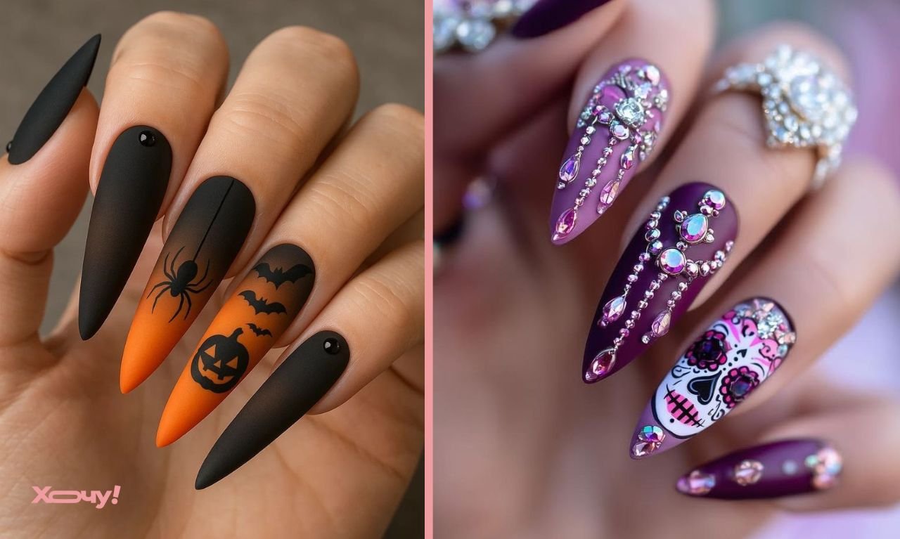 В моде — яркие, контрастные ногти на Хэллоуин. Они могут иметь разную длину или форму — по вашему предпочтению. Такие идеи дизайна будут подходить как для длинных, острых ноготков, так и для коротких. Миксуйте глянец и матовый эффект, добавляйте блестки и объемные детали с помощью геля.
