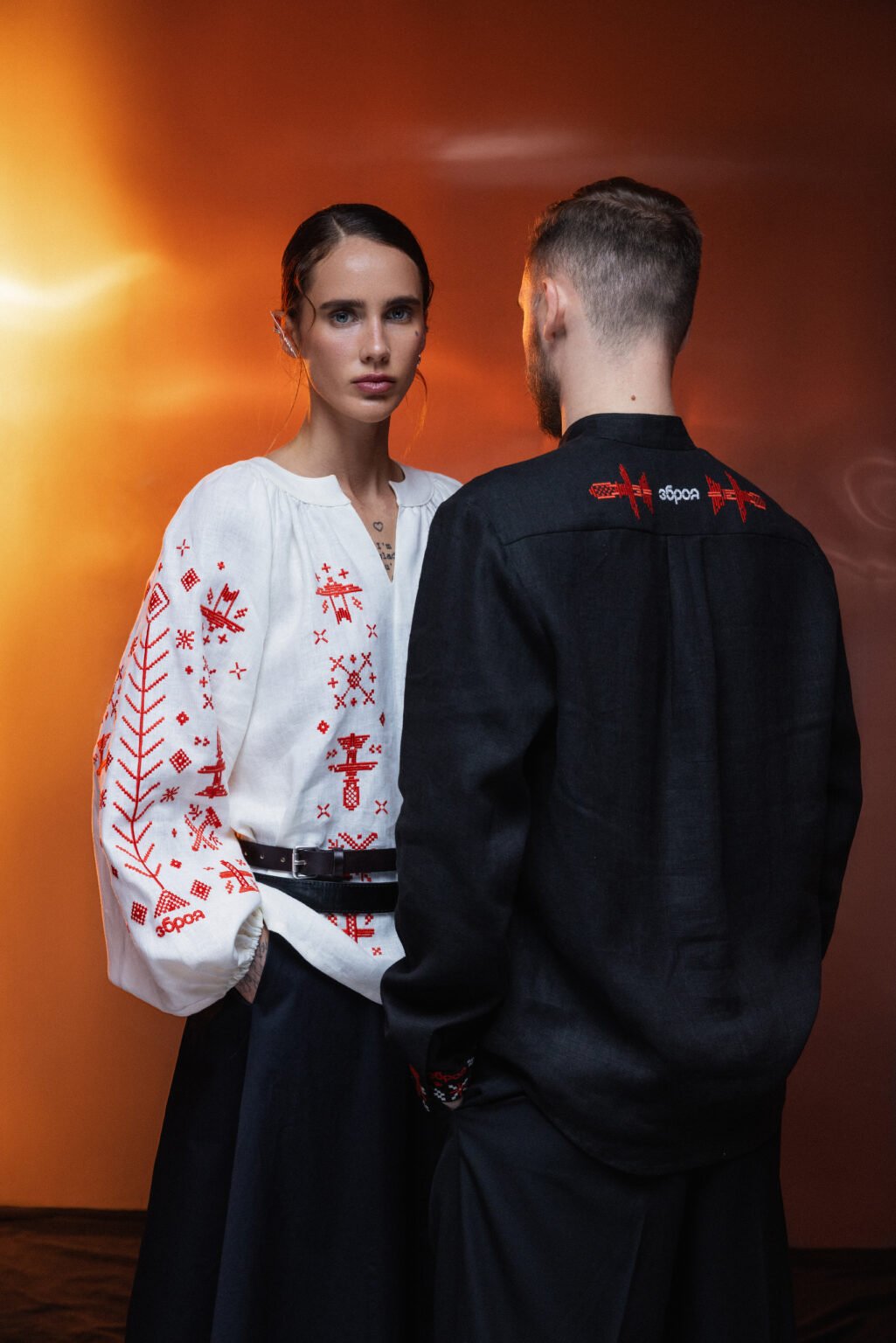 Мужская рубашка доступна в черном, а женская – белом цвете. Вышивка в обоих вариантах – в красном цвете. Изображение оружия переплетается в вышивке с симметричным орнаментом. А на рукавах женской вышиванки вышитая веточка как символ связи между поколениями.