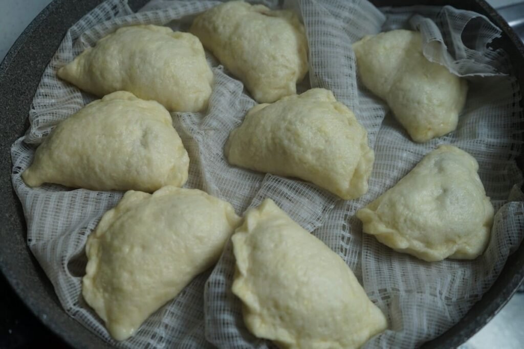 Когда вода закипит, сбрызгиваем марлю водой. Выкладываем вареники и накрываем крышкой, варим 6 минут.
