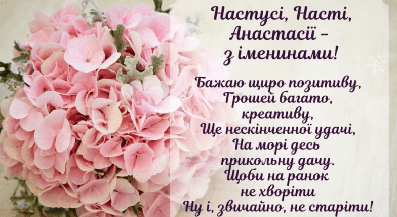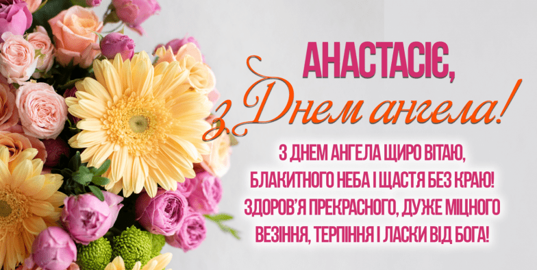 Дорога Анастасіє, з Днем ангела! Нехай Ваша небесна покровителька вбереже від бід і негараздів. Нехай кожен день починається з посмішки, а поруч завжди будуть люблячі люди. Здоров'я вам, радості та нехай виконуються всі заповітні бажання.