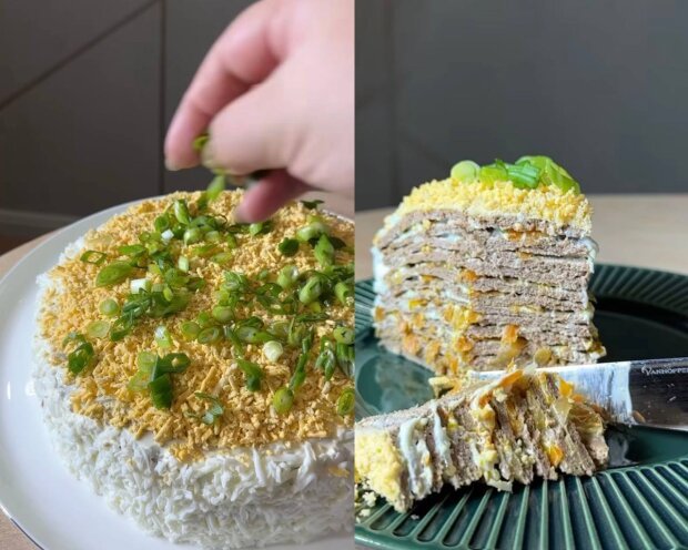 Начинаем формировать наш торт. Блинчик смазываем соусом, затем выкладываем жареный лук и морковь, затем снова блинчик. И так к концу. Верхний блинчик смазываем майонезом, а сверху трем вареное яйцо и посыпаем измельченным зеленым луком.