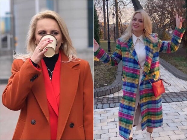 Отметим, что пальто в клетку невероятно популярны этой весной. В тренде так же и классические модели всевозможных оттенков. Один из вариантов – терракотовое и нежно-голубое, как у Лилии Ребрик.
